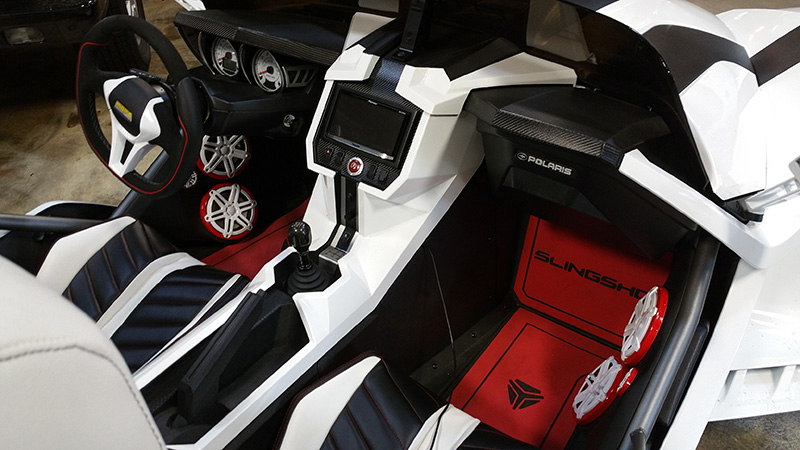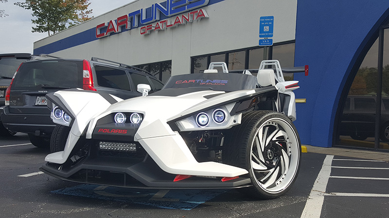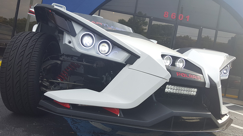 Custom lighting is a must on a vehicle this wild so we incorporated the halo rings with HID lights in pure white to continue the white out along with some white highlight lighting under and around.