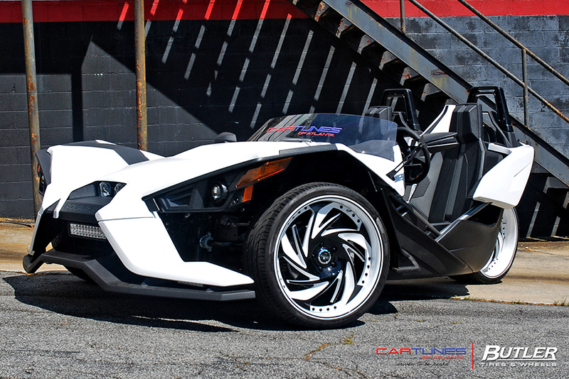 For wheels, we had to go with something that would really set it off, and with the help of Butler Tire and Savini Wheels we ended up with custom built Savini Diamond Carpi 22’s. We decided on a cool white color scheme and incorporated that scheme into the wheels. We also designed a few touches of red and carbon fiber to highlight certain parts to help it pop. The red is teased from the inside out and the motif is wrapped together with the carbon fiber wings and hood accents.